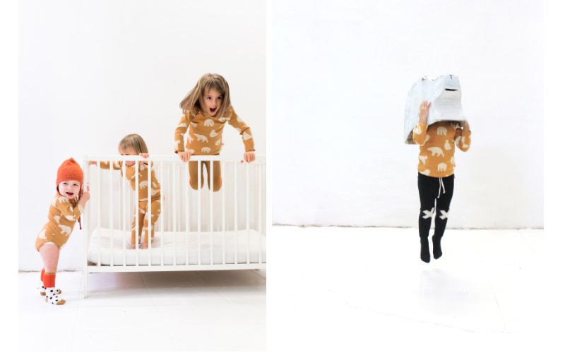 В новой коллекции Tiny Cottons только самые уютные и теплые материалы: пима хлопок и мериносовая шерсть, выкрашенные в насыщенные цвета зимней природы: темно-синий (цвет зимней ночи), коричневый (такой же, как стволы деревьев), глубокий зеленый (цвет хвойных веток), ярко-оранжевый (цвет опавшей листвы, виднеющейся из под снега), черный и белый.